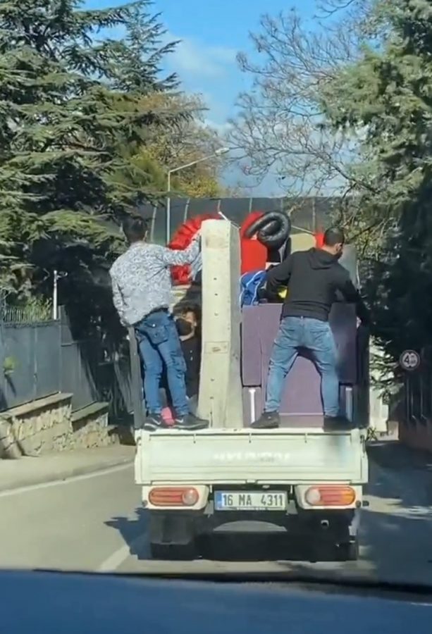 Bursa'da evlerini taşımak isteyen bir grup vatandaş, kazaya davetiye çıkardı. Kamyonetin arkasına yükledikleri eşyaların arasında kendilerine de yer bulan vatandaşlar, tehlikeli yolculukla herkesin yüreğini ağzına getirdi. Hiçbir can güvenlikleri olmadan yolculuklarına devam eden 3 kişi, kasanın kenarında ayakta eşyalara tutunarak kilometrelerce yol aldı. Arkadan gelen araçtan çekilen görüntüler bu kadarına da pes dedirtti.