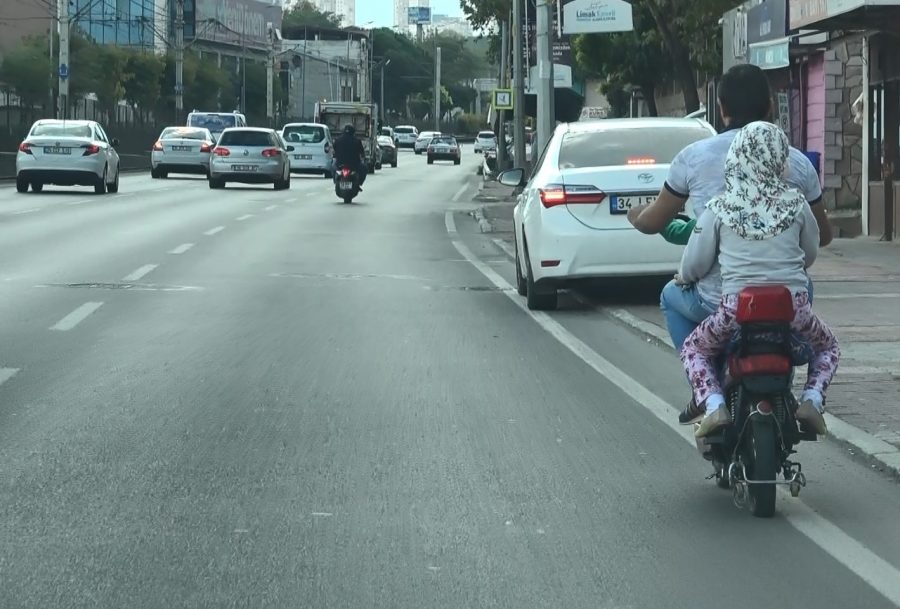 Sürücü, önünde ayakta duran 5 yaşlarındaki çocuk ve arkasında düşmemek için sıkı sıkı tutunan 8 yaşlarındaki çocuk ile adeta kazaya davetiye çıkararak yol aldı.
