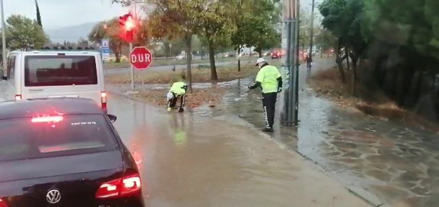 Yol üzerinde trafik kontrolü yapan 2 polis memuru, biriken suyun gittikçe arttığını görünce elleriyle rögarı temizledi.