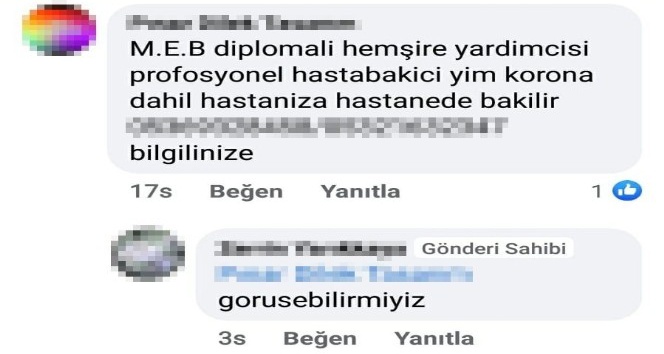 Bir kadın sosyal medya kullanıcısı tarafından grup sayfasında, “Mudanya Devlet Hastanesinde Covid-19 servisinde yatan erkek hastaya refakatçi arıyoruz, yardımcı olmak ister misiniz?” diye paylaşım yapıldı. Paylaşımın altına yapılan yorumlarda, bazı kullanıcılar ilana tepki gösterirken, bazılarının ise “ücrette anlaşabilirsek ben kalabilirim” yazması dikkatleri çekti.