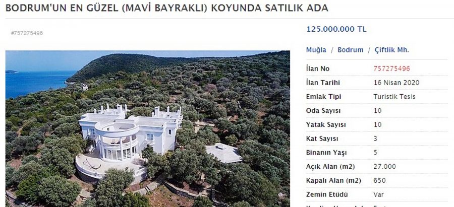 125 milyon liralık fiyat biçilen adanın imara uygun olmadığı ancak satın alan kişinin ruhsat başvurusu yaparak villayı ve bulunduğu araziyi otel olarak işletebileceği bilgisi verildi. Koronavirüs salgını nedeniyle ünlü futbolcu Cristiano Ronaldo'nun kendini ve ailesini adada karantina altına almasının ardından Türkiye'de de satılık adalara olan ilginin arttığı öğrenildi.