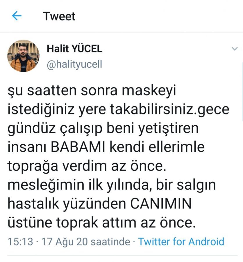 Babası corona virüs nedeniyle yaşamını yitiren doktor Halit Yücel, maske takmayanlara, "Şu saatten sonra o maskeyi istediğiniz yere takabilirsiniz. Gece gündüz çalışıp beni yetiştiren insanı, babamı kendi ellerimle toprağa verdim az önce" diye isyan etti.