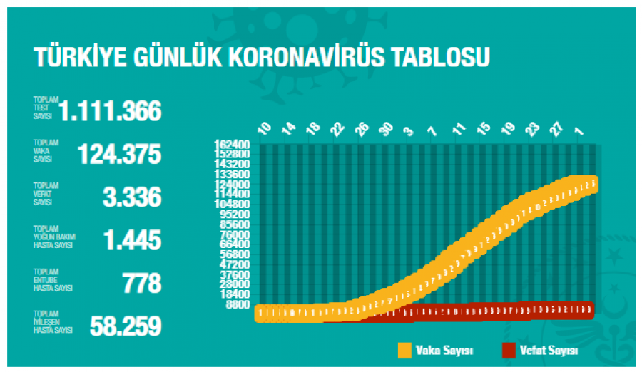 Açıklamaya göre, son 24 saatte 78 kişi korona virüsten hayatını kaybetti, toplam can kaybı ise 3 bin 336 oldu. Bugün toplam 36 bin 318 test yapılırken bin 983 yeni vaka tanısı koyuldu. Toplam vaka sayısı ise 124 bin 375 oldu. Bugünkü 4 bin 451 kişi ile birlikte toplam iyileşen sayısı 58 bin 259'a yükseldi. Toplam entübe hasta sayısının 778 toplam yoğun bakım hasta sayısının ise bin 445 olduğunu açıkladı.