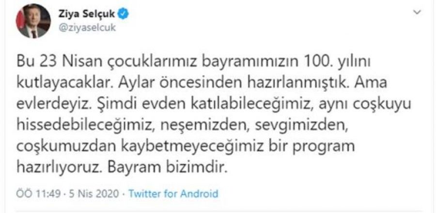 Milli Eğitim Bakanı Ziya Selçuk, "Bu 23 Nisan çocuklarımız bayramımızın 100. yılını kutlayacaklar. Aylar öncesinden hazırlanmıştık. Ama evlerdeyiz. Şimdi evden katılabileceğimiz, aynı coşkuyu hissedebileceğimiz, neşemizden, sevgimizden, coşkumuzdan kaybetmeyeceğimiz bir program hazırlıyoruz. Bayram bizimdir" dedi.
