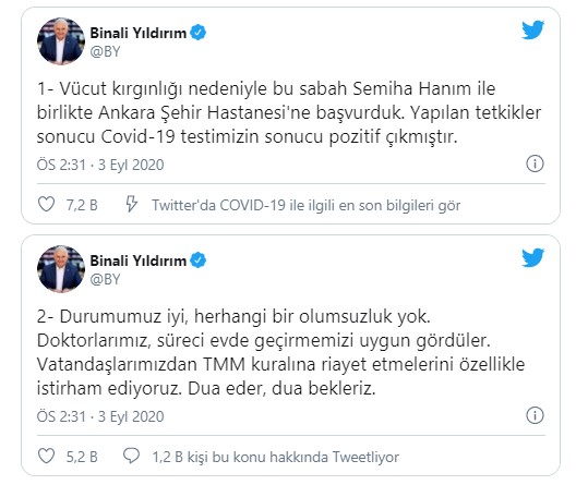 "Vücut kırgınlığı nedeniyle bu sabah Semiha Hanım ile birlikte Ankara Şehir Hastanesi'ne başvurduk. Yapılan tetkikler sonucu Covid-19 testimizin sonucu pozitif çıkmıştır.
