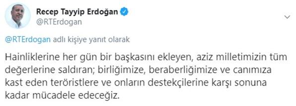 Erdoğan, Twitter hesabından Van'ın Özalp ilçesinde Vefa Sosyal Destek Grubu görevlilerine yönelik terör saldırısına ilişkin paylaşımda bulundu.