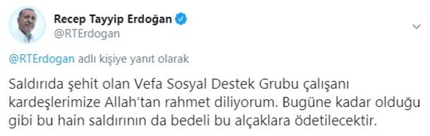 Saldırıda şehit olan Vefa Sosyal Destek Grubu çalışanı kardeşlerimize Allah’tan rahmet diliyorum. Bugüne kadar olduğu gibi bu hain saldırının da bedeli bu alçaklara ödetilecektir.