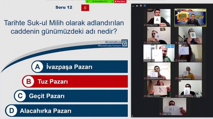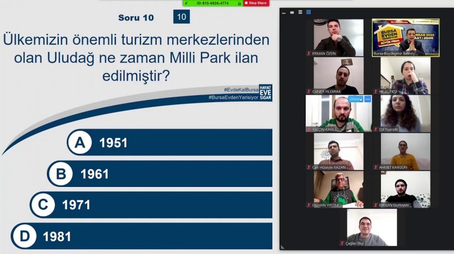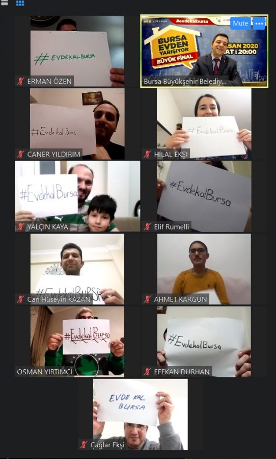 Gökhan Küçükkaplıdağ'ın sunduğu yarışmaya tele konferans yönetimiyle evlerinden katılan 10 finalist, Bursa ve Covid-19 salgınına ilişkin hazırlanan sorulara doğru cevap verebilmek için ter döktü. Basın Yayın ve Halka İlişkiler, Bilgi İşlem Daire başkanlıkları ve Strateji Geliştirme Şube Müdürlüğü tarafından projelendirilerek hayata geçirilen yarışmanın finalinde toplam 20 sorudan 19'una doğru cevap veren Osman Yırtımcı birinci oldu. Mudanya'da ikamet eden Yırtımcı, bir cep telefonu ve kitap setinin sahibi oldu. Yarışmanın sonunda tüm finalistler, ellerindeki kartları kaldırarak Bursalıları evde kalmaya davet etti.