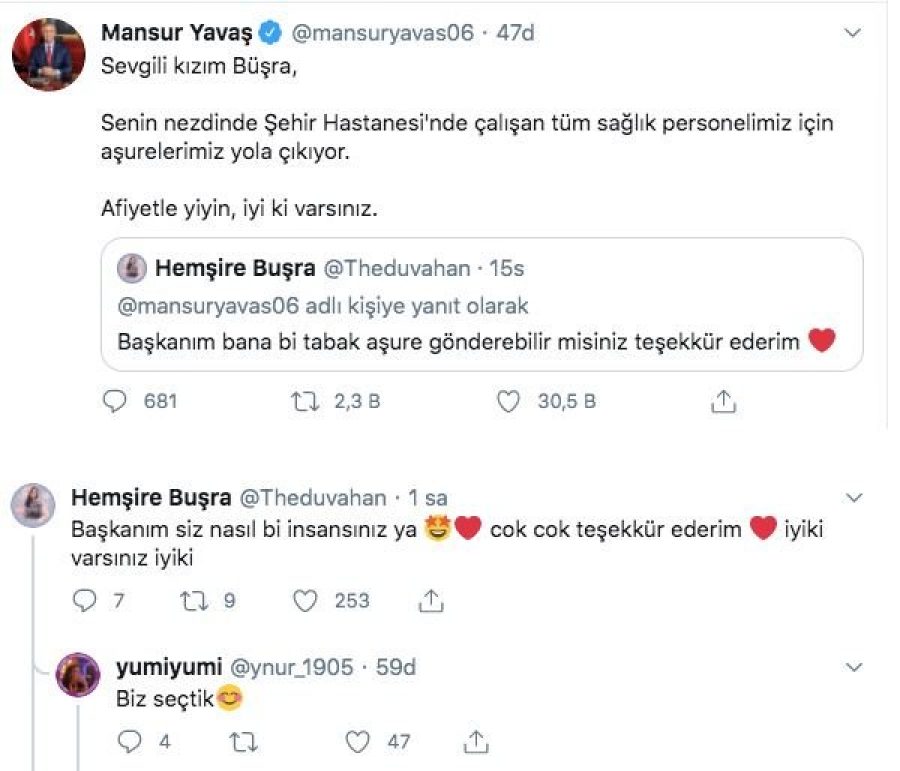 Ankara Şehir Hastanesi'nde görevli Büşra hemşire, önceki gün Twitter'da, Ankara Büyükşehir Belediye Başkanı Mansur Yavaş'ı etiketleyerek, 'Başkanım bana bir tabak aşure gönderebilir misiniz, teşekkür ederim' paylaşımını yaptı. Başkan Yavaş, "Sevgili kızım Büşra, senin nezdinde Şehir Hastanesi'nde çalışan tüm sağlık personelimiz için aşurelerimiz yola çıkıyor. Afiyetle yiyin, iyi ki varsınız" ifadeleriyle Büşra hemşireye cevap verirken, hazırlanan aşureler de Ankara Şehir Hastanesi'nde görev yapan sağlık çalışanlarına gönderildi.