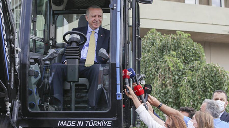Erdoğan, alana gelişinin ardından Hidromek HICON 7W elektrikli yerli ekskavatörü hakkında bilgi aldı. Yerli üretim ekskavatörü inceleyen Erdoğan, tören alanına yakın alanda kullandığı araçla toprak attı.