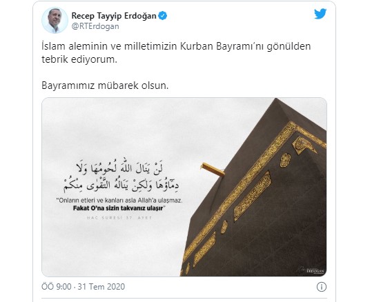 Bakan Soylu da "Sayın Cumhurbaşkanım, hayırlı bayramlar diliyor, hürmet ediyoruz. Allah kabul etsin. Allah tekrarını nasip etsin inşallah." dedi.