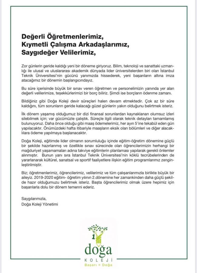 Doğa Koleji çalışanlarına gönderdiği mesajda düzenli maaş yatırma günlerinin ise her ayın 5'i olarak belirlendiği ifade edildi.