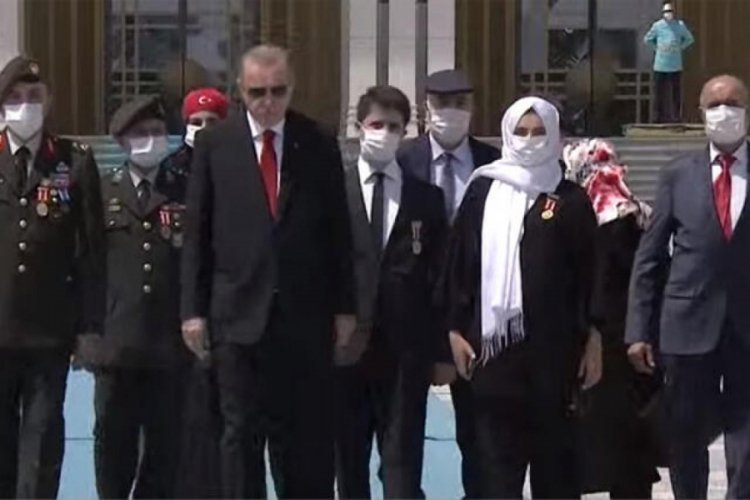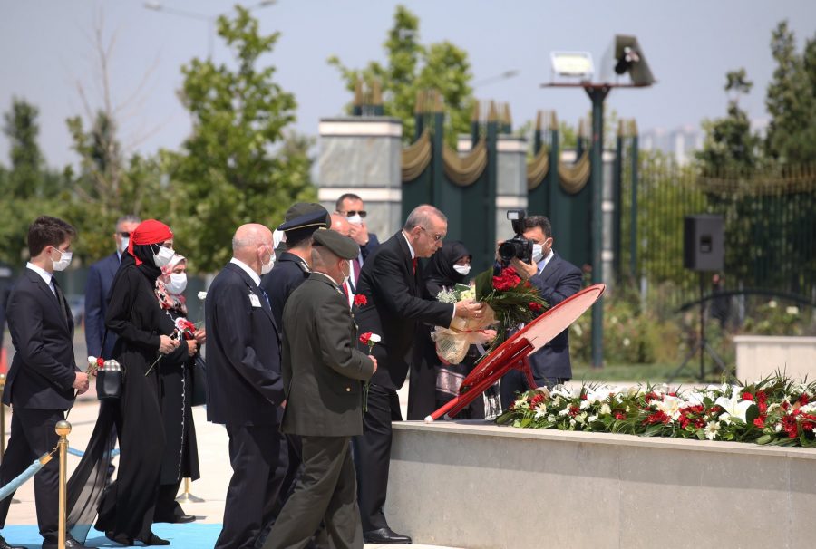 Bazı şehit yakını ve gazilerle birlikte abideye yürüyen Erdoğan'a, kısa süre önce Cumhurbaşkanı Başdanışmanlığı görevine atanan 15 Temmuz gazisi eski Emniyet Genel Müdürlüğü Terörle Mücadele Daire Başkanı Turgut Aslan da eşlik etti. 15 Temmuz Şehitler Abidesi'ne çiçek bırakan Erdoğan, daha sonra şehitler için dua etti.