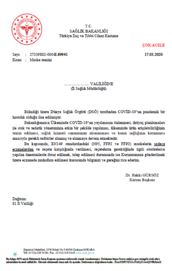Bu kapsamda EN149 standardındaki (N95, FFP2 ve FFP3) maskelerin sadece eczanelerden ve reçete karşılığında verilmesi, reçetelerin gerektiğinde ilgili otoritelerce yapılan denetimlerde ibraz edilmek, talep edilmesi durumunda ise Kurumumuza gönderilmek üzere eczanede muhafaza edilmesi hususunda bilginizi ve gereğini rica ederim"