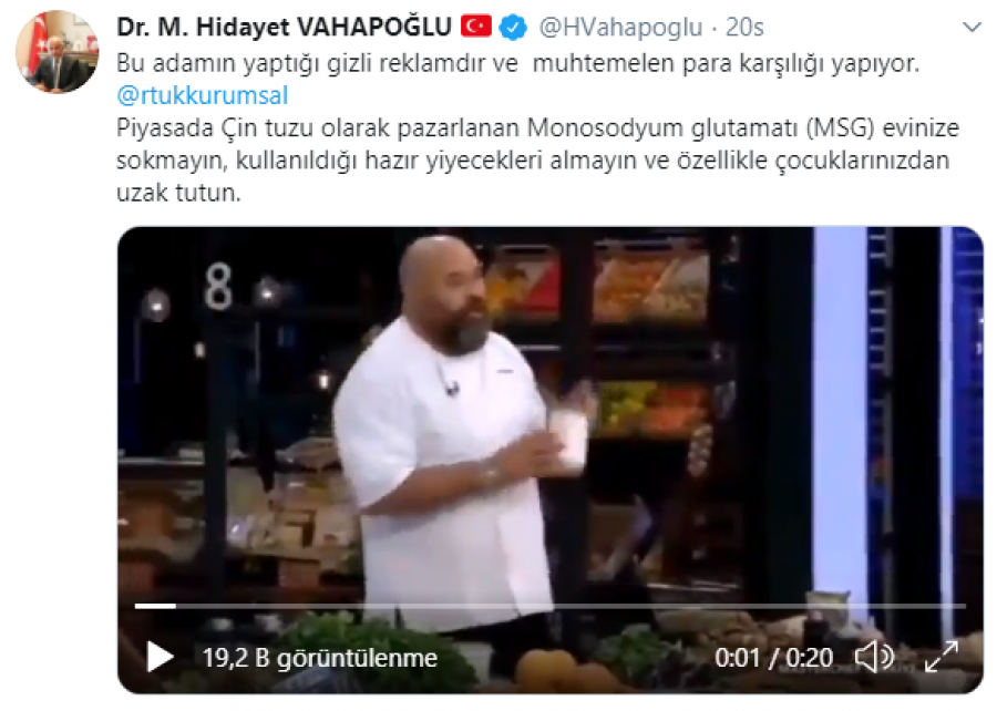 İki kurumu etiketlediği paylaşımında Vahapoğlu, paylaşımında şu ifadeleri kullandı "Bu adama Çin tuzunun reklamını ne karşılığı yaptın diye birisi sormalı monosodyum glutamat (MSG) yiyecklere sahte lezzet katan,bağımlılık yapan, doyma hissini ortadan kaldıran, kalp-damar hastalıkları ve obezitenin öncelikli sebeplerindendir. Gizli reklamdır
