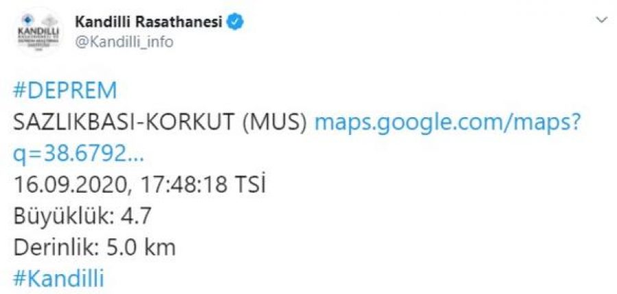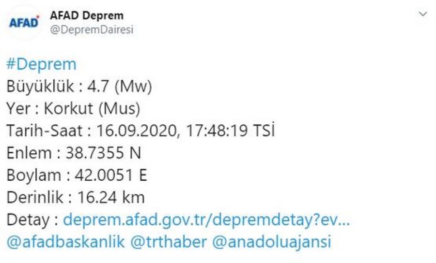 Afet ve Acil Durum Yönetimi Başkanlığı Muş'un Korkut ilçesinde saat 17.48'de 4,7 büyüklüğünde bir deprem meydana geldiğini bildirdi.