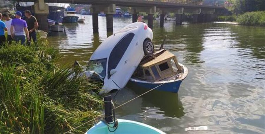 Otomobil nehir kenarındaki teknenin üzerine düştü