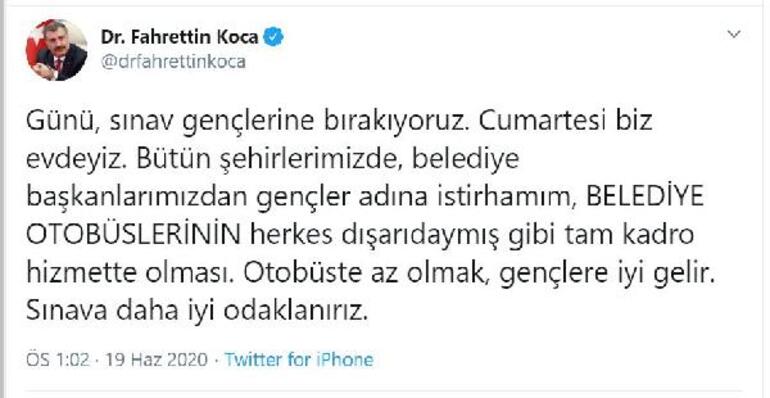 Koca, "Günü, sınav gençlerine bırakıyoruz. Cumartesi biz evdeyiz. Bütün şehirlerimizde belediye başkanlarımızdan gençler adına istirhamım, belediye otobüslerinin herkes dışarıdaymış gibi tam kadro hizmette olması. Otobüste az olmak, gençlere iyi gelir. Sınava daha iyi odaklanırız." ifadelerini kullandı.
