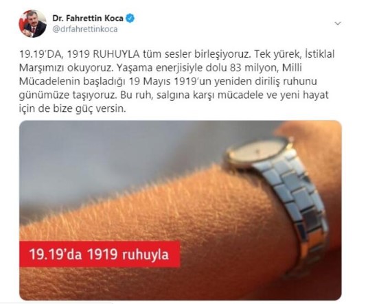 19.19’DA, 1919 RUHUYLA tüm sesler birleşiyoruz. Tek yürek, İstiklal Marşımızı okuyoruz. Yaşama enerjisiyle dolu 83 milyon, Milli Mücadelenin başladığı 19 Mayıs 1919’un yeniden diriliş ruhunu günümüze taşıyoruz. Bu ruh, salgına karşı mücadele ve yeni hayat için de bize güç versin.