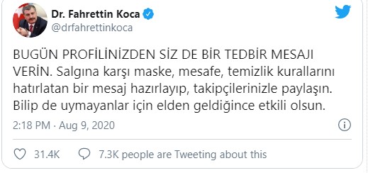 Öte yandan Sağlık Bakanı Fahrettin Koca, Twitter'dan bir görüntü paylaşarak koronavirüsle ilgili uyarılarda bulundu.