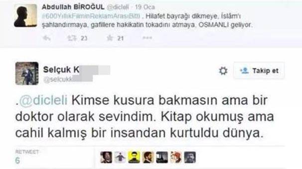 Diyarbakır’ın Kulp İlçesi’nden kent merkezine giderken yol kesen PKK’lıları görünce kaçmaya çalışan doktor Abdullah Biroğul, teröristlerin açtığı ateşte hayatını kaybetmişti. Dün Sabah 09.58 sıralarında Edirne’nin Süloğlu İlçesi’ndeki Toplum Sağlığı Merkezi’nde görevli doktor Selçuk K., ‘selcukkilickov’ kullanıcı adıyla Twitter hesabından meslektaşının ölümüne sevindiğini yazan bir Tweet attı. Yazısında öldürülen Abdullah Biroğul’un daha önce paylaştığı "Hilafet bayrağını dikmeye, İslam’ı şahlandırmaya, gafillere hakikatın tokadını atmaya OSMANLI geliyor" atıfta bulunan Selçuk K., "Kimse kusura bakmasın ama bir doktor olarak sevindim. Kitap okumuş ama cahil kalmış bir insandan kurtuldu dünya" ifadelerini kullandı.