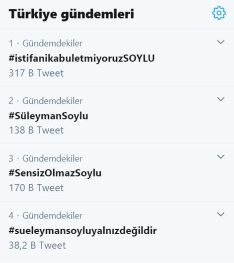 Soylu'nun istifa açıklamasının ardından Twitter'de yüz binlerce mesaj yağdı. Twitter'ın trend listelerinin ilk sıraları Soylu'ya destek içeren "hastag"lerle doldu.