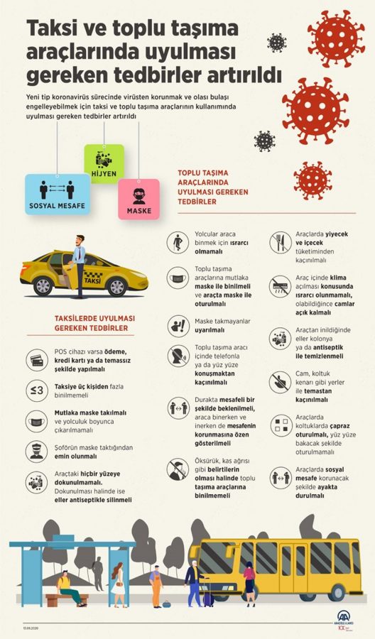 Otobüs, minibüs, midibüs, metro, tramvay gibi toplu taşıma araçlarında ise yeni tedbirler hayata geçirildi. Toplum sağlığının korunması için müşterilerin bireysel olarak yapması gereken tedbirlerden bazıları şu şekilde sıralandı: