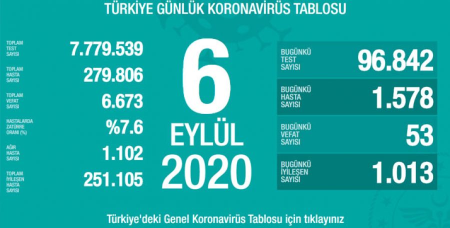 Türkiye'de son 24 saatte 96 bin 842 Kovid-19 testi yapıldı, 1578 kişiye hastalık tanısı konuldu.